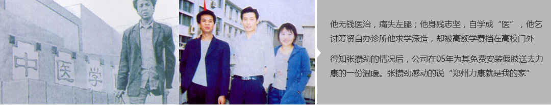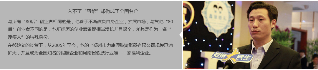 鄭州市力康假肢矯形器有限公司(簡(jiǎn)稱力康),是一家專業(yè)從事假肢矯形器的設(shè)計(jì)、研發(fā)、制作及裝 配的專業(yè)機(jī)構(gòu)。成立于1992年是河南省唯一一家福利企業(yè)。力康下設(shè)業(yè)務(wù)部、技術(shù)部、住院部、康復(fù) 部、售后服務(wù)部,并配有現(xiàn)代化的裝配車間和功能齊全的訓(xùn)練大廳,為殘疾朋友康復(fù)訓(xùn)練提供了可靠 保障??偨?jīng)理穿戴假肢多年,有著豐富的臨床經(jīng)驗(yàn)和親身體會(huì);多年來,力康已為全國(guó)幾十萬名殘疾 朋友安裝上舒適、美觀、耐用的假肢和矯形器具,使他們更大限度地恢復(fù)了正常的工作和生活。“產(chǎn) 品即人品”的質(zhì)量理念、先進(jìn)的技術(shù)、實(shí)惠的價(jià)格、完善的售后服務(wù)是力康取勝的法寶……